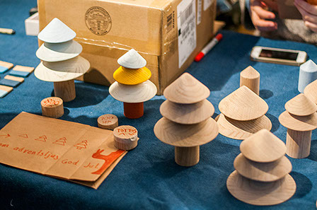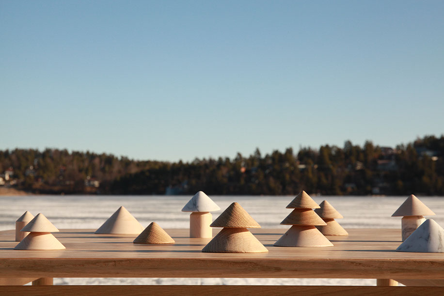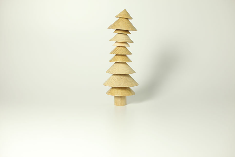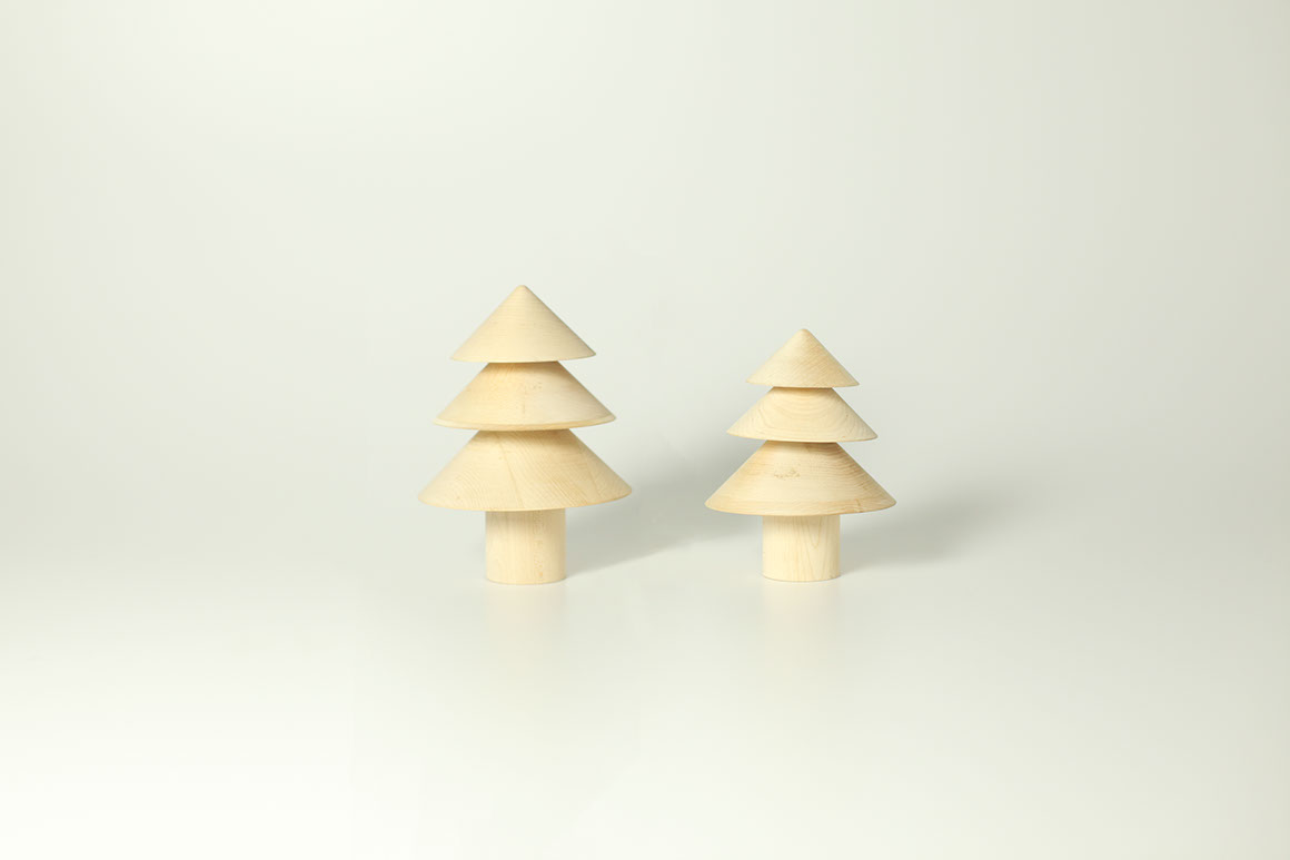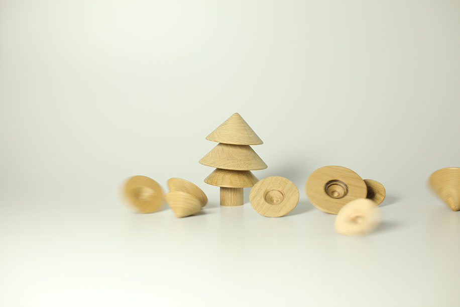 Playful oak, maple, and marble cone shapes stack interchangeably to create a solemn tree or iconic forest.